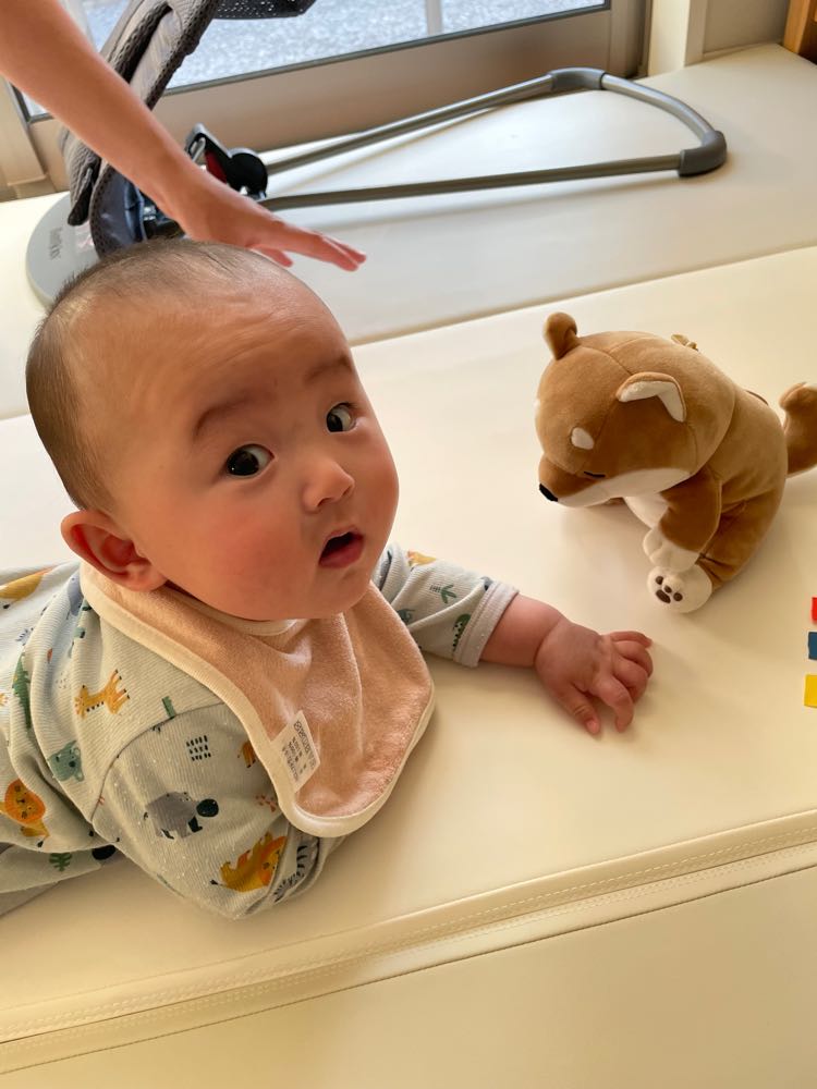 うつ伏せ練習で、柴犬のぬいぐるみを発見した尚央。