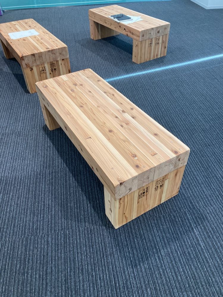 秋田杉で作られたベンチは、触り心地が柔らかく、香りも良いそうです。渋谷区のスポーツ施設等に81台設置してあるそうです。