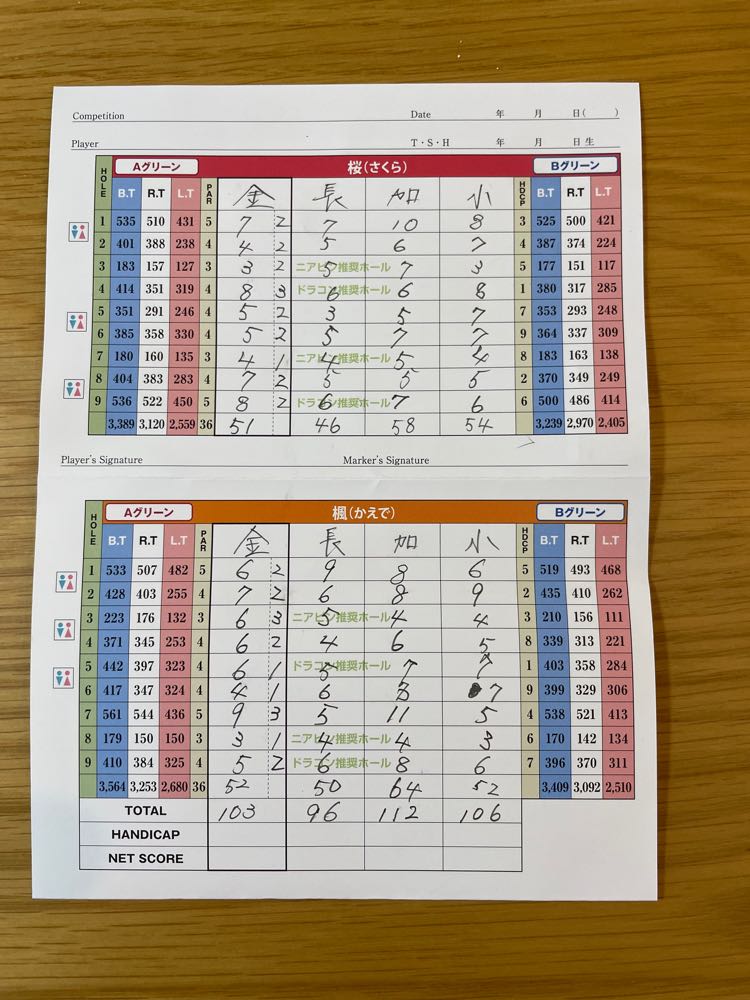 立ち上がりは、よかったのですが、途中でセカンドショットで、距離があって、いつもなら8番アイアンで刻んで、3打目アプローチするところを、7番アイアンで力んでシャンク。そこからズルズルとスコアを崩して、100切りできず。