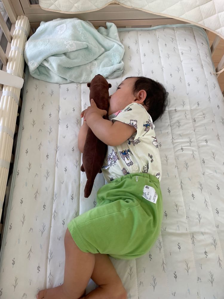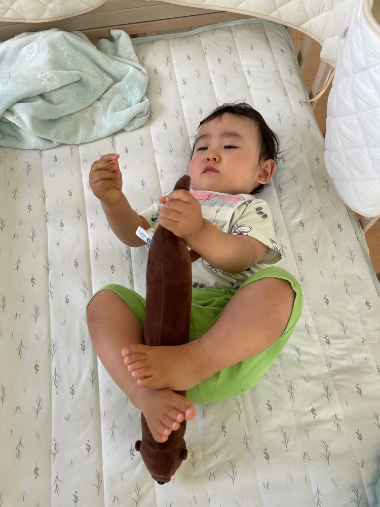 朝からカワウソのぬいぐるみとプロレス中の尚央。