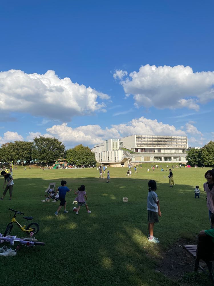 広い芝生広場で、たくさんの人たちが遊んでいました。