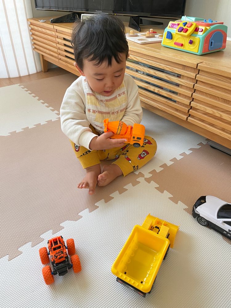 昨日は、児童館でリサイクルマーケットがあって、みんなで持ち寄ったものを3つまで無料で貰えるとのこと。子供服とかいろいろあったけど、尚央は働く車の3点にしたそうです。