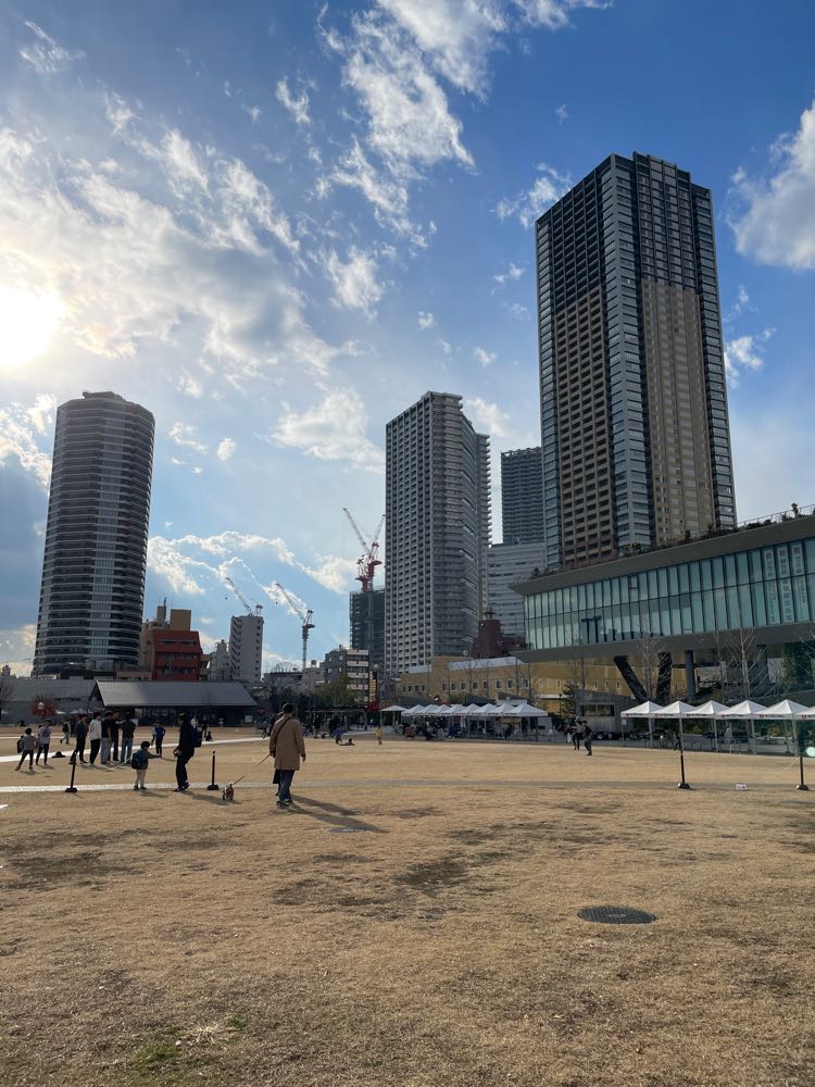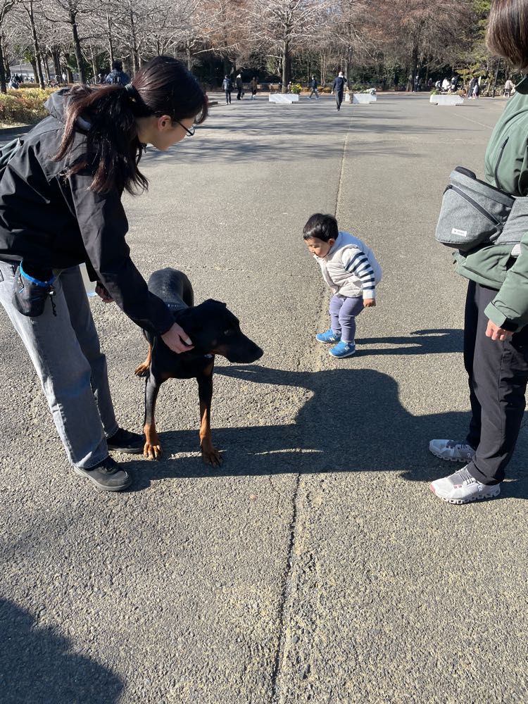 光が丘公園でワンちゃんと触れ合う尚央。