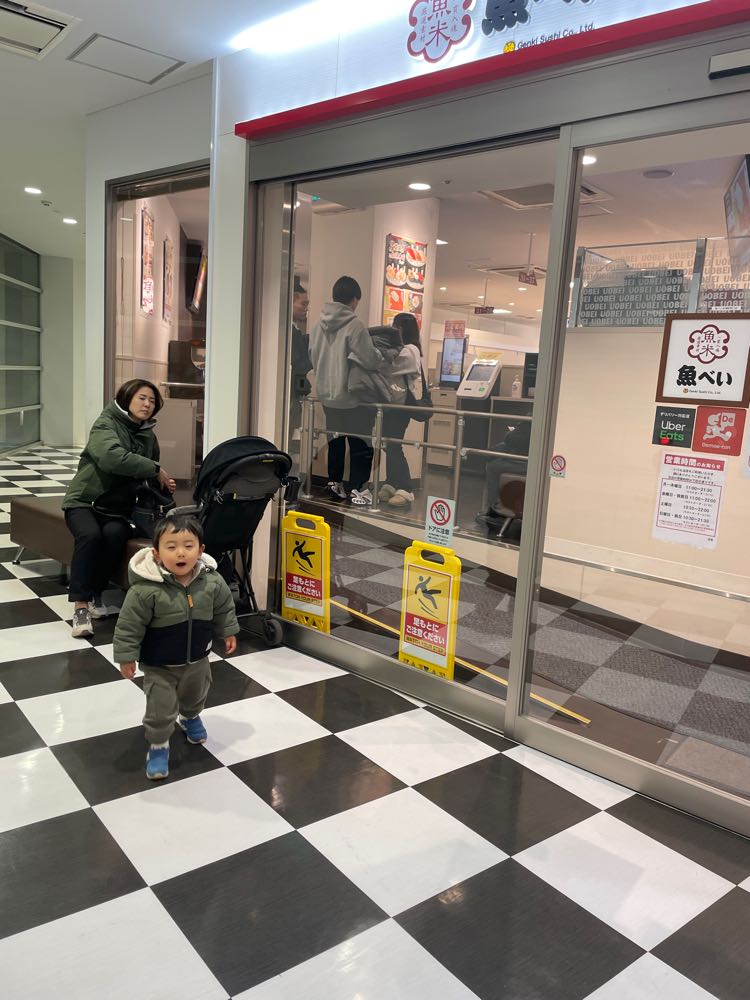 尚央は、はじめてのお寿司です。お店の前のホールを走り回って、お腹を空かせていました。
