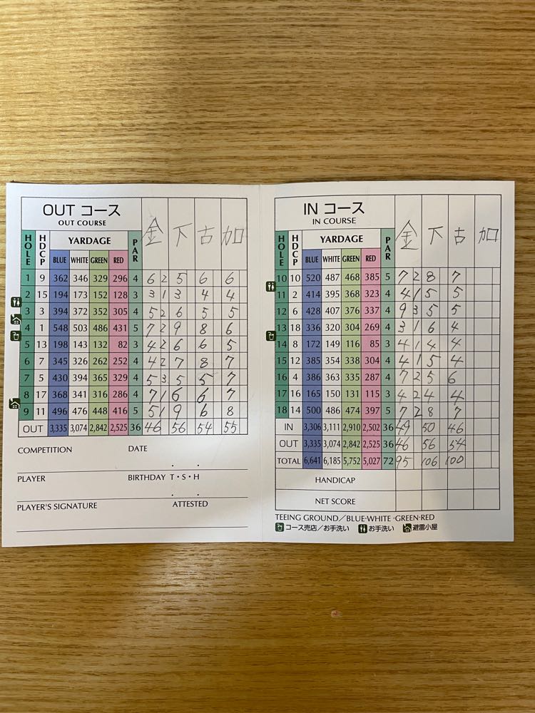高低差がフェアウェイが狭く、ドライバーがかなり苦戦しましたが、パターが好調で、100切りできました。
