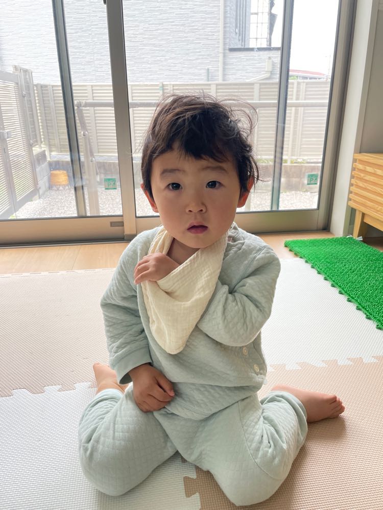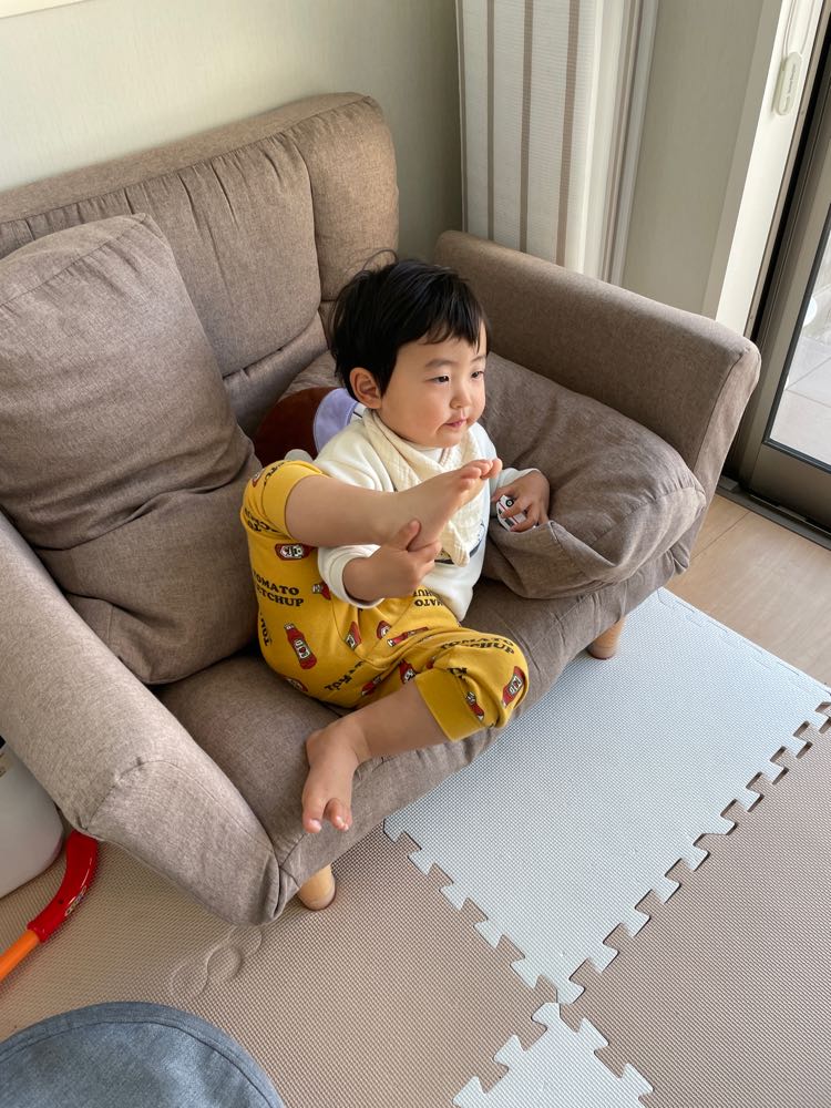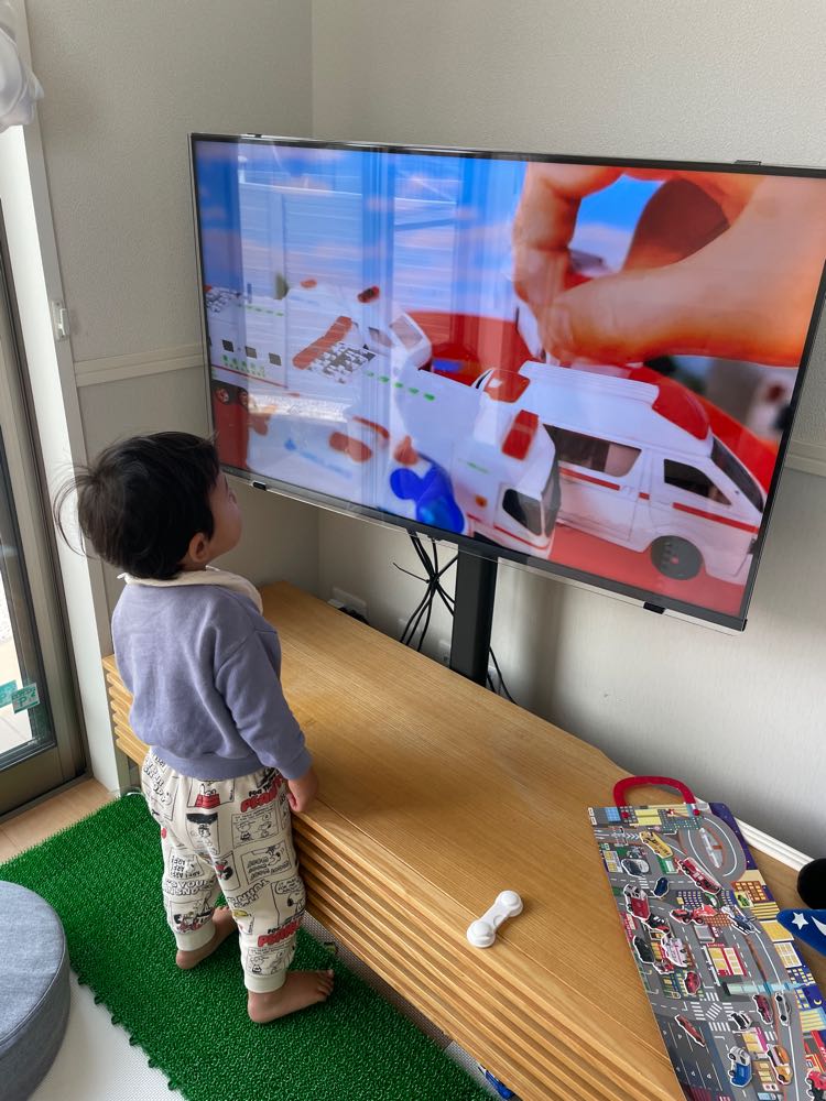気持ちいい日曜日の朝。トミカのYouTubeを観ながら寛ぐ尚央。