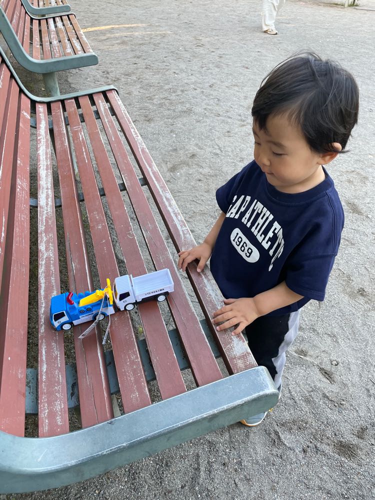 西松屋で見つけたJAFのレッカー車のおもちゃ。軽トラックがくっついているのが面白いみたいです。