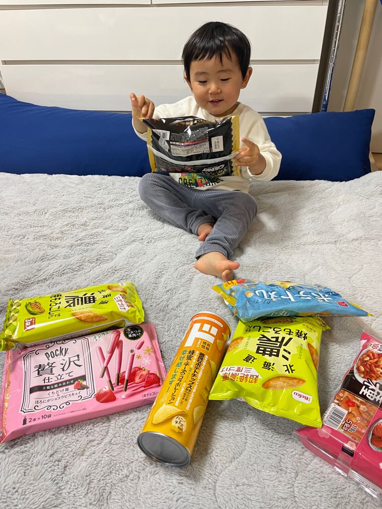 ドンキのお菓子に囲まれて、ご満悦な尚央です。