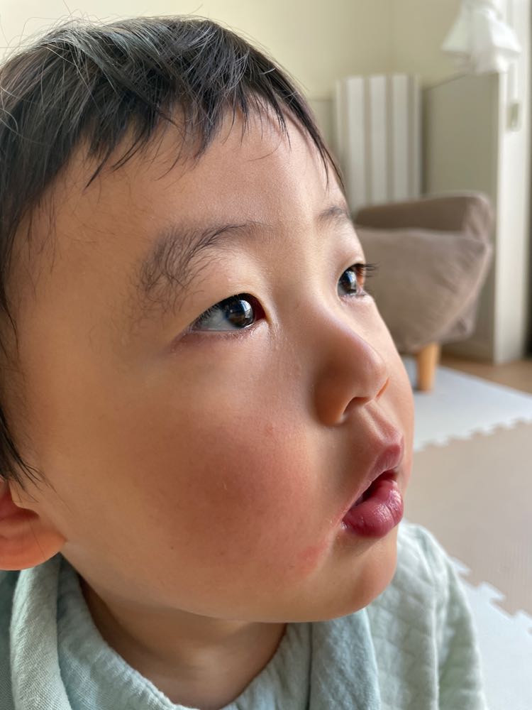 保育園の方針で、1歳児は外遊びがなくて、室内だけで遊んでいます。そのストレスなのか、尚央の顔にぶつぶつが…