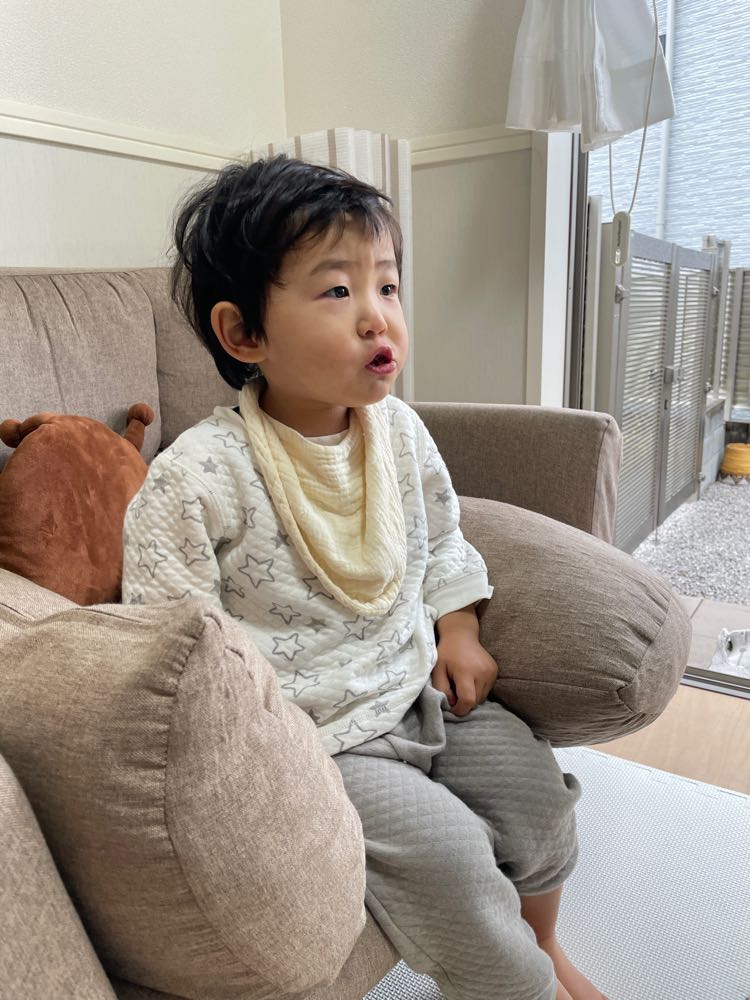 イヤイヤ期に入った尚央。テーブルで食べるのがイヤで、ソファでYouTubeを見ながら食べさせています。