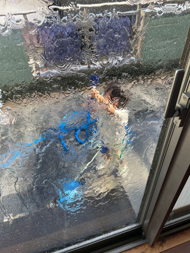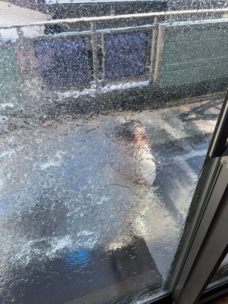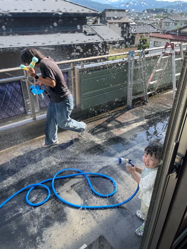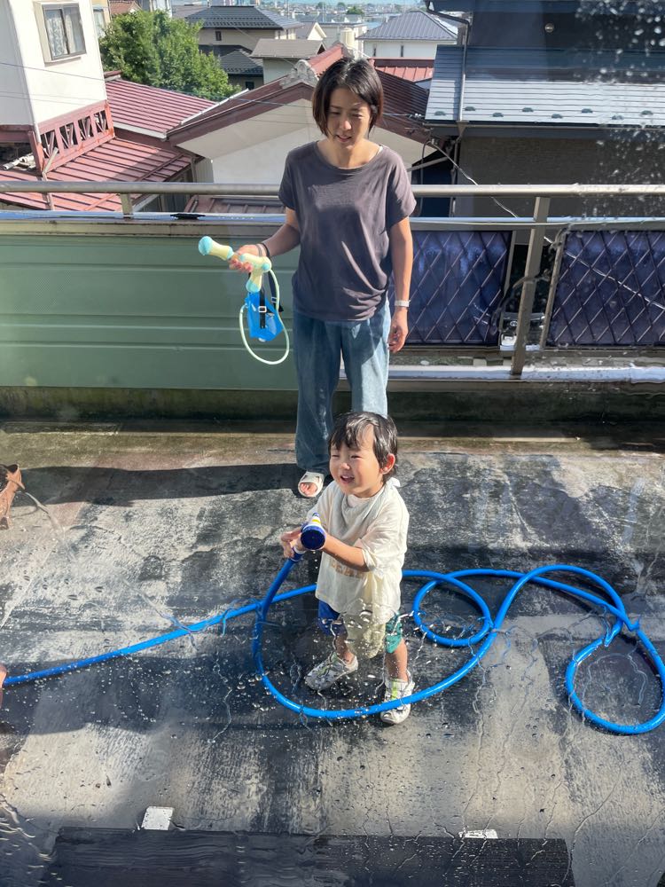 暑くなった今日は、ベランダで水遊びをした尚央。