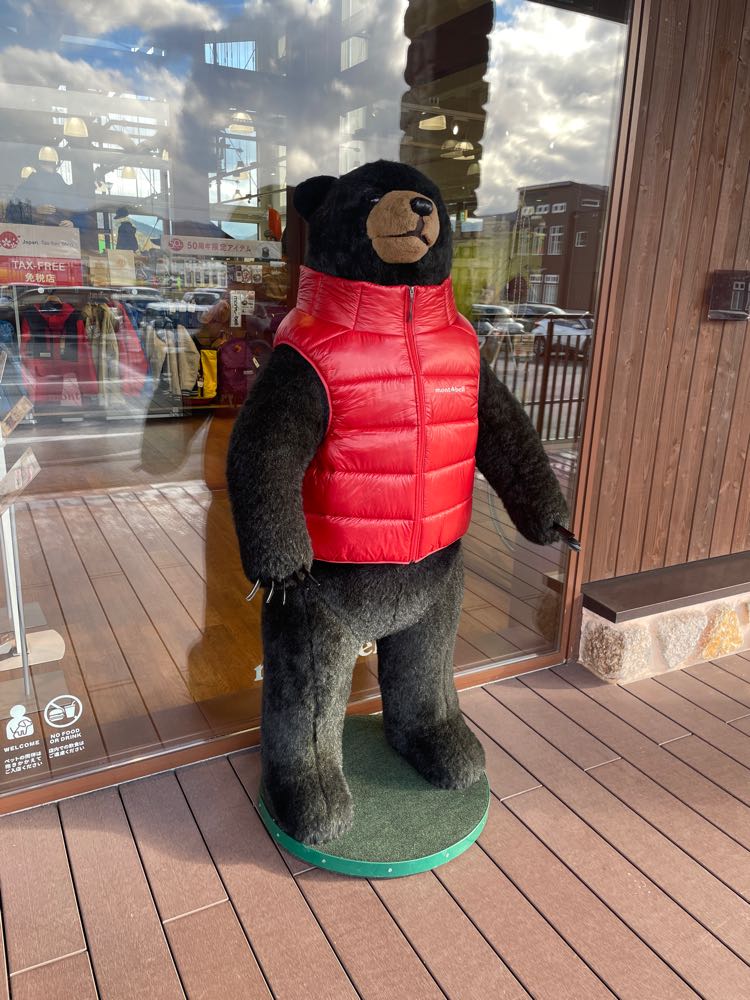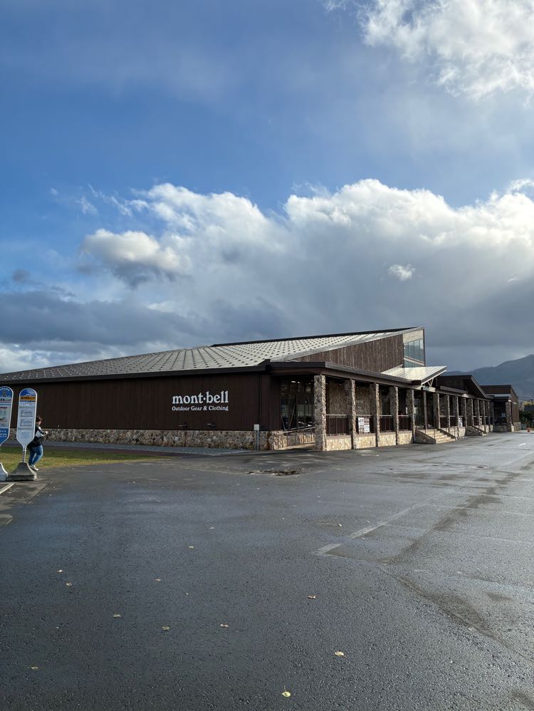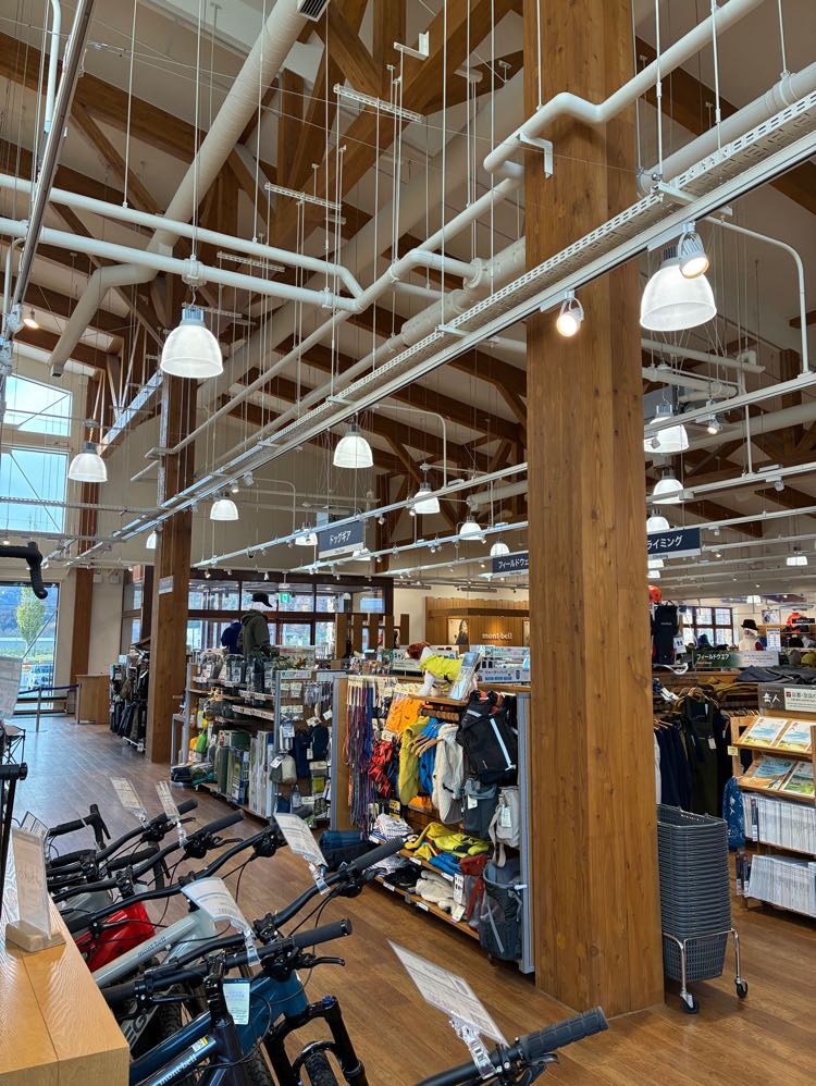 道の駅南ふらの。こちらは地元材のカラマツの集成材です。熊がトレードマークのモンベルが出店しています。